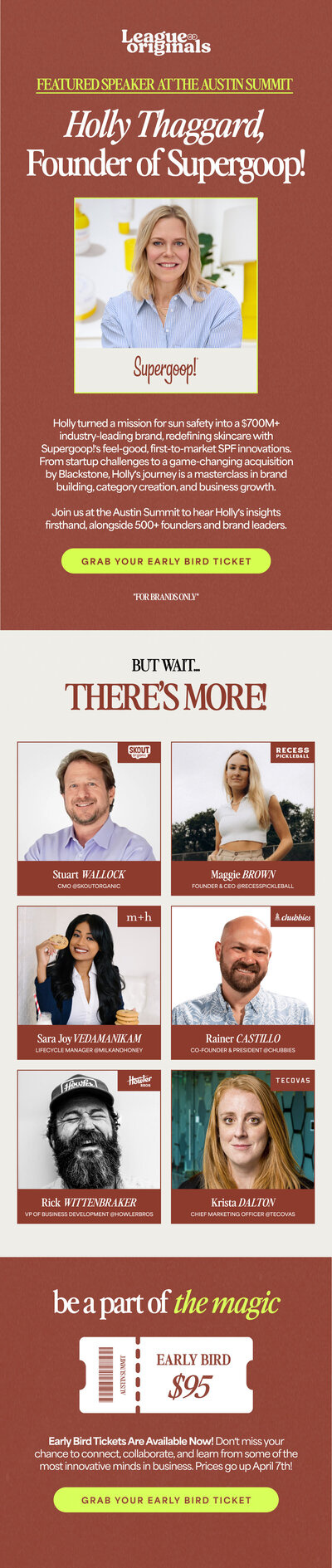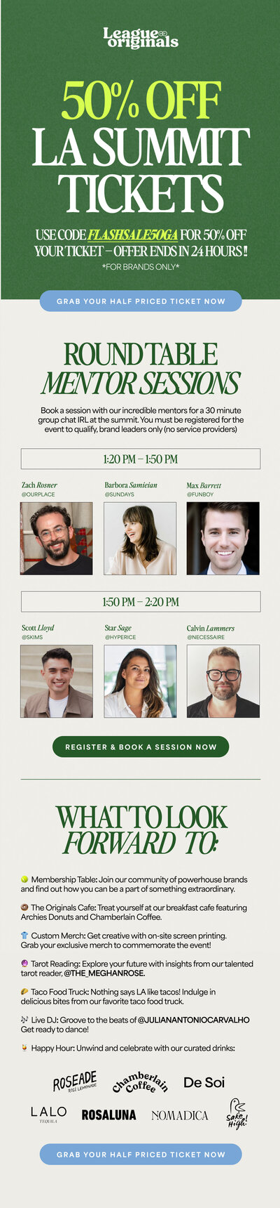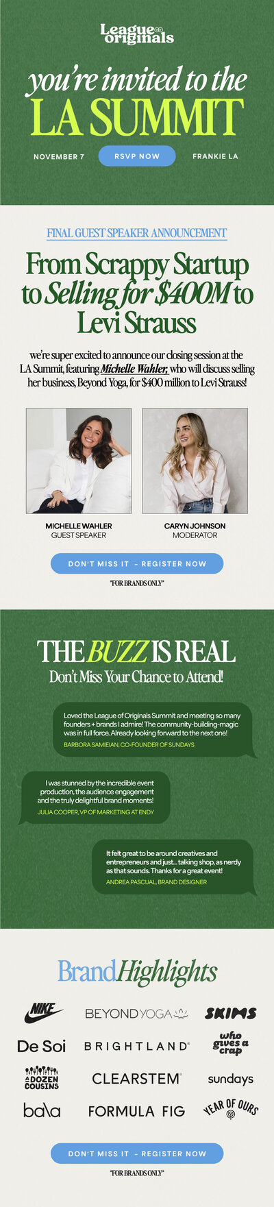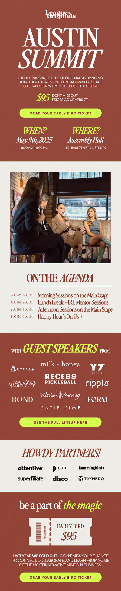 I’ve worked with League of Originals to drive buzz around their events in Austin, LA, and Toronto through targeted email campaigns. From cold outreach to new email flows for their brand marketing bootcamp, we’ve helped boost ticket sales and build excitement with every send.