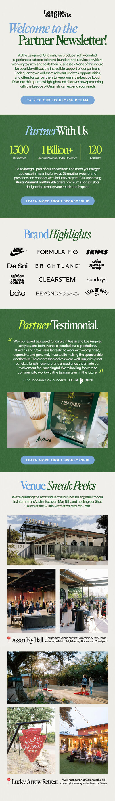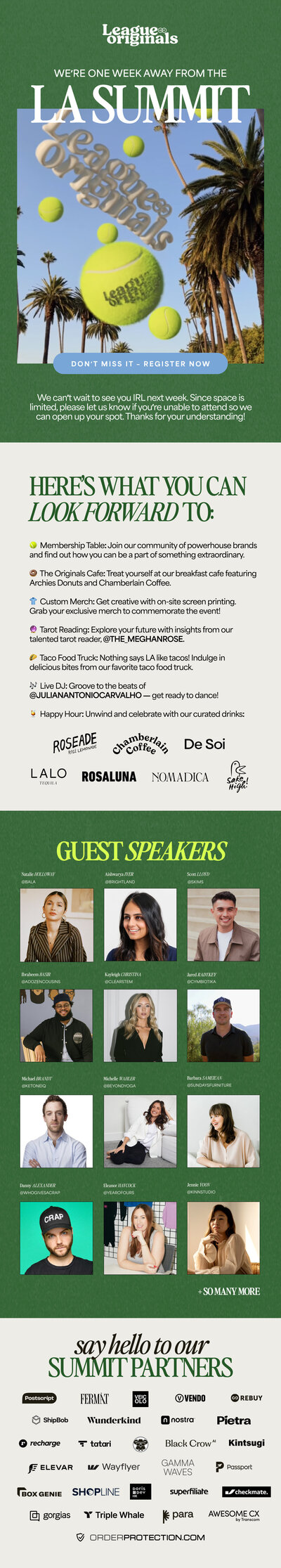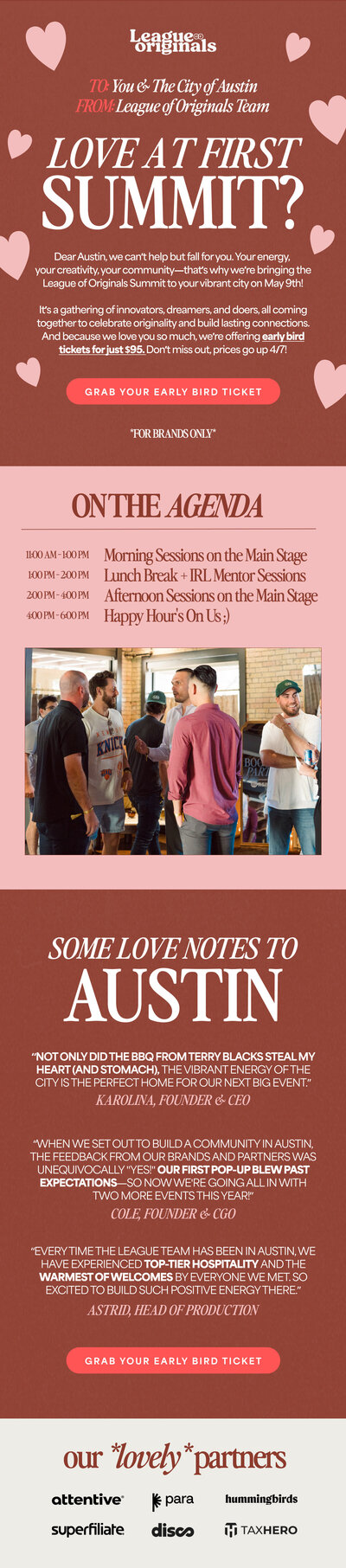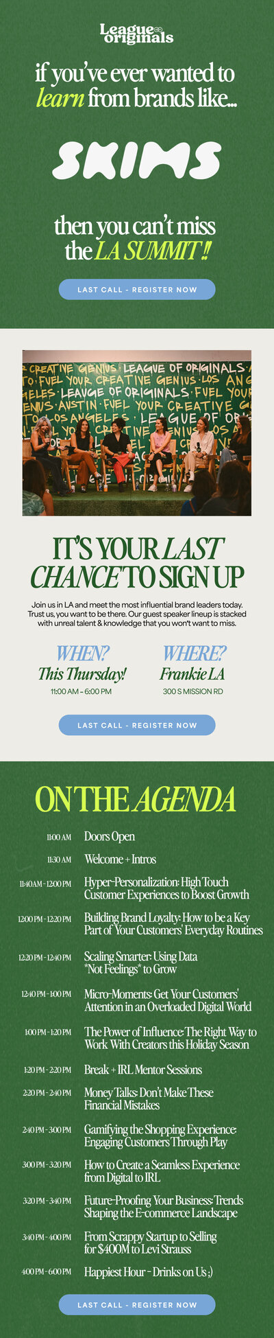 I’ve worked with League of Originals to drive buzz around their events in Austin, LA, and Toronto through targeted email campaigns. From cold outreach to new email flows for their brand marketing bootcamp, we’ve helped boost ticket sales and build excitement with every send.