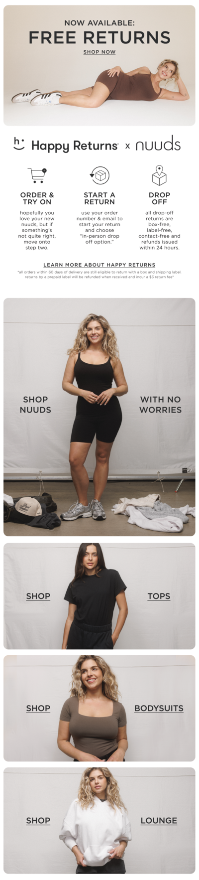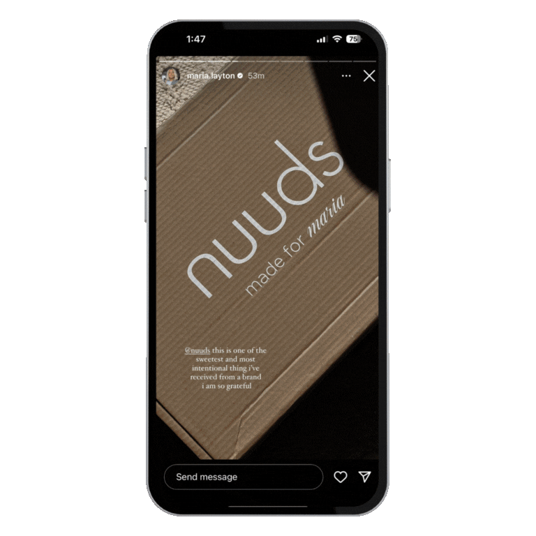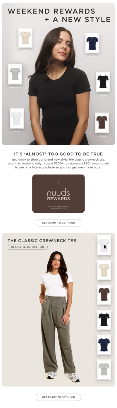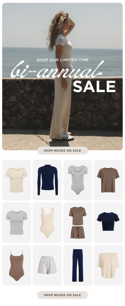 nuuds is a clothing brand that aims higher than just high quality basics. this role gave me the opportunity to run their entire lifecycle marketing channel – and as a result, helped me find my passion for email design. I also had the pleasure of working on various brand activations including pop-up event branding, influencer gifting design & social media graphics.