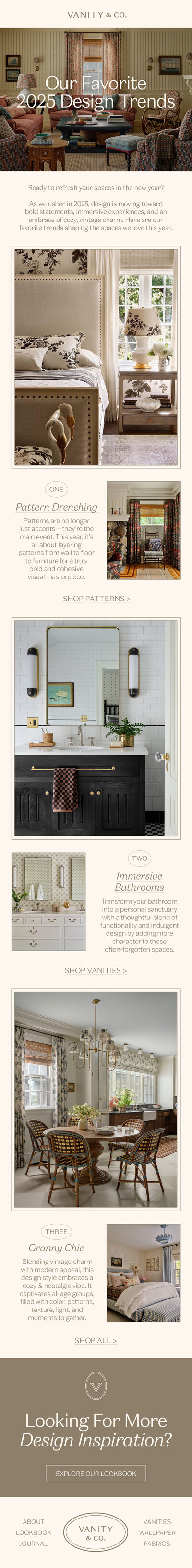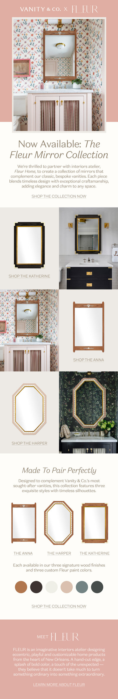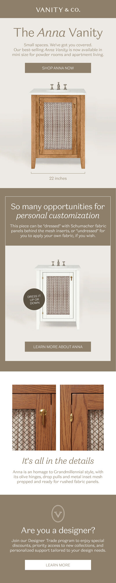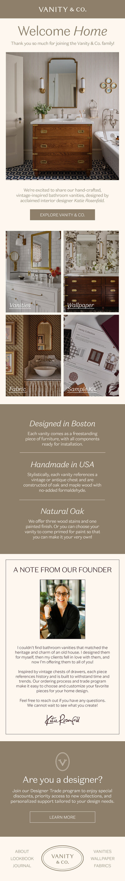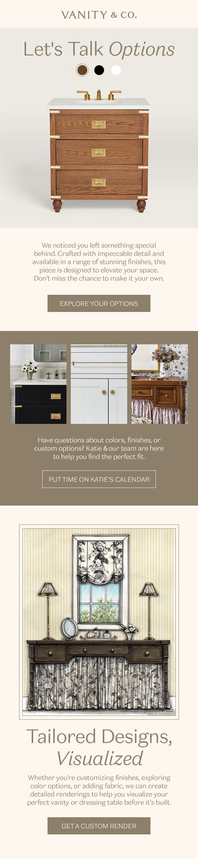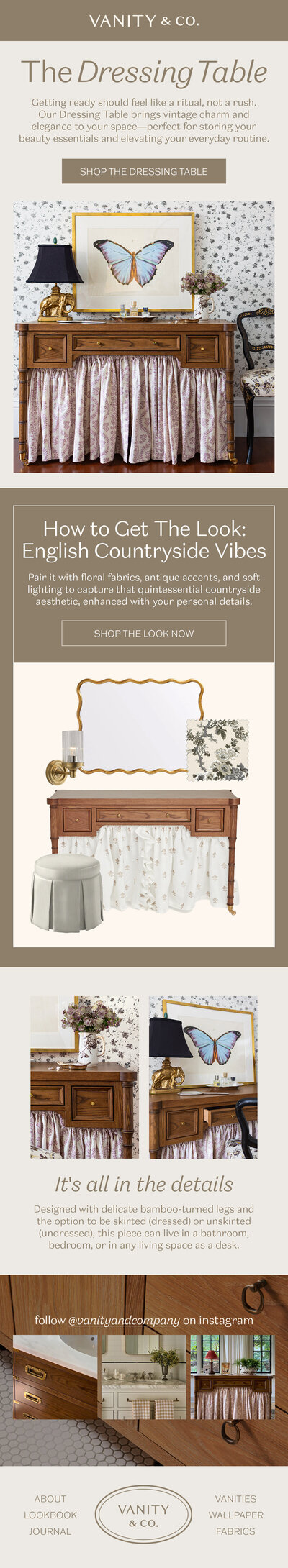 Vanity & Company, created by interior designer Katie Rosenfeld, offers heirloom-inspired vanities and dressing tables with timeless design and vintage charm. I was lucky enough to design a full suite of email flows, from welcome to post-purchase, to convert subscribers into loyal customers. Additionally, our team creates weekly campaigns that showcase their elegant products including vanities, mirrors, and accessories with beautiful visuals and inviting copy that drive sales.
